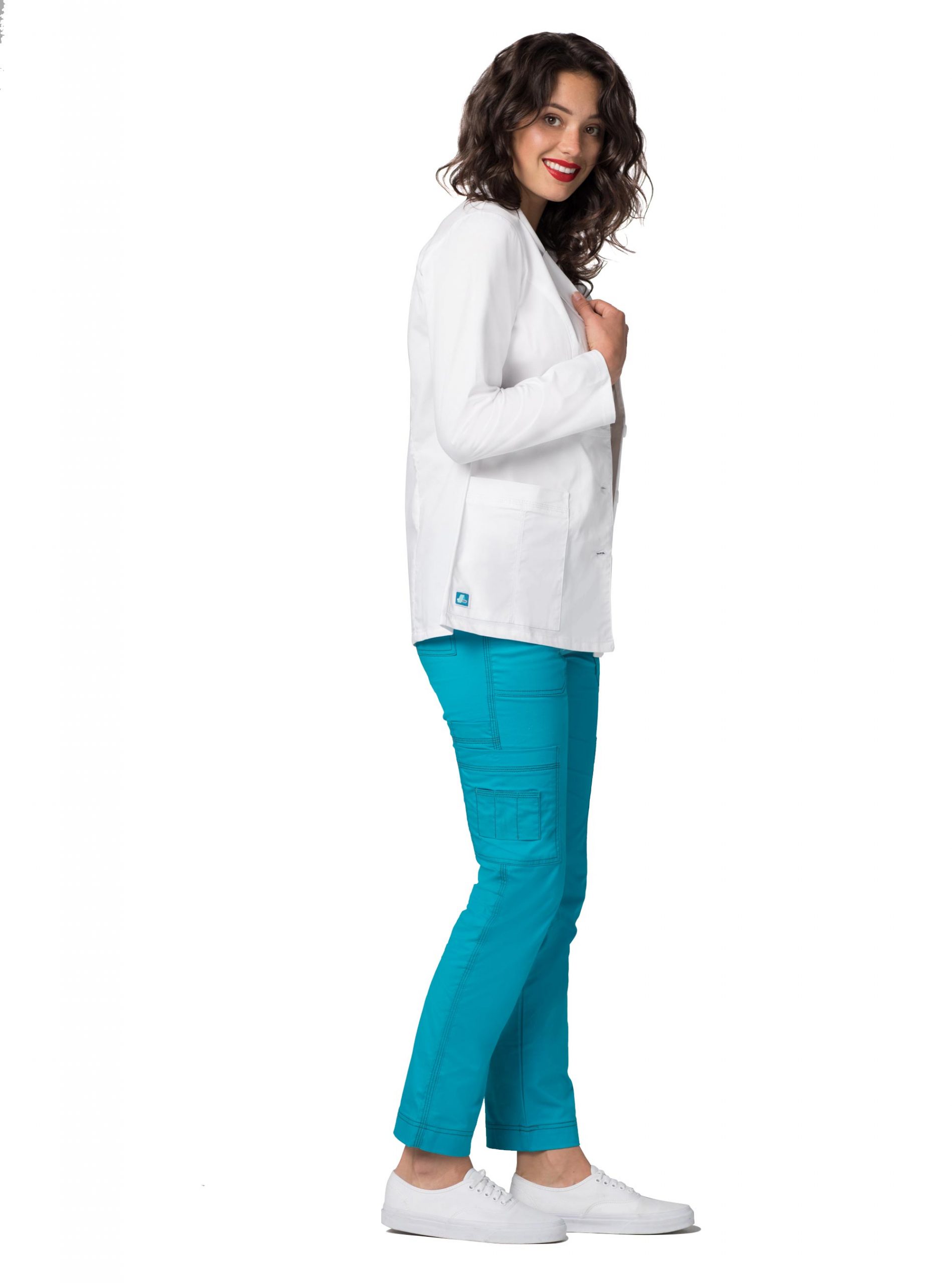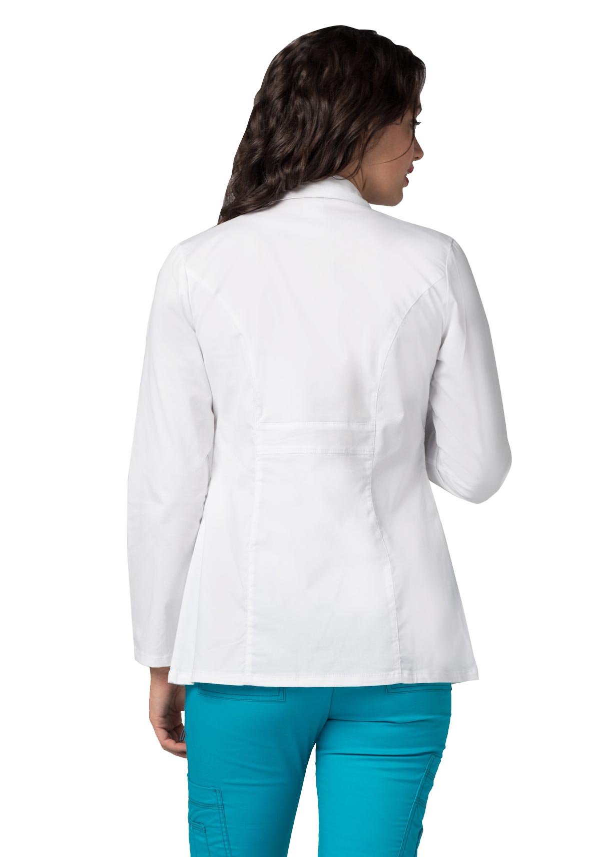 Junior fit lab coat in a beautifully tailored princess-seamed style gets a contemporary pop from multi needle tone on tone top stitching. Features include lapel collar, midriff with non functional snap-enhanced tab detail, patch pockets and back belt. Center back length 28″.